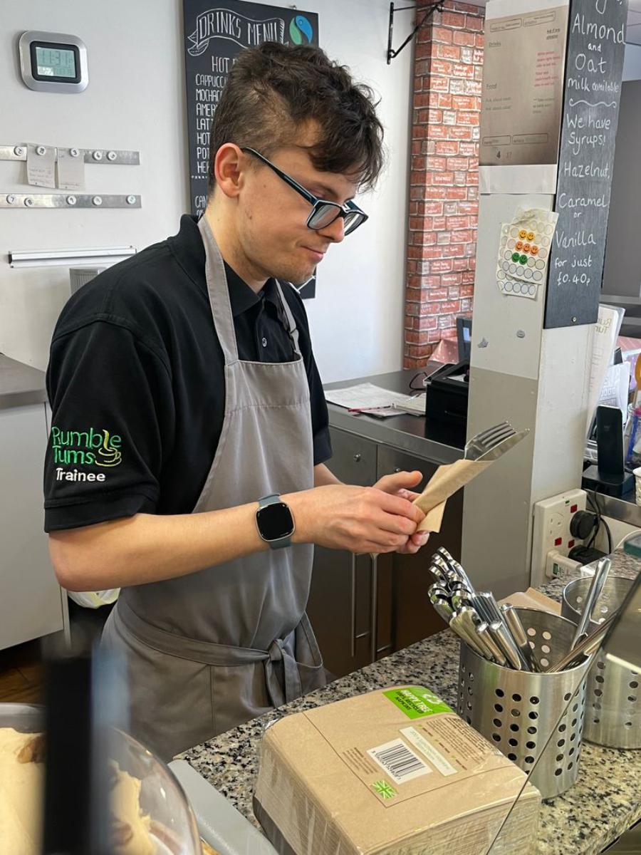 Training at Rumbletums is based primarily in our café where trainees undertake a range of duties suitable to their abilities. We offer a high level of supervision to ensure that everyone who trains at Rumbletums is fully supported and we aim to build on each person’s needs and abilities.